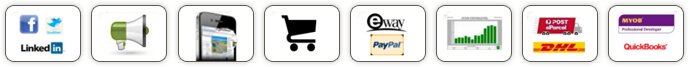 Paypal, Eparcel, MYOB, SMS, Shopping Cart, Vada, Google Analytics/Adwords, CRM's, Westpac, ANZ, CommBank, Eway, WorldPay